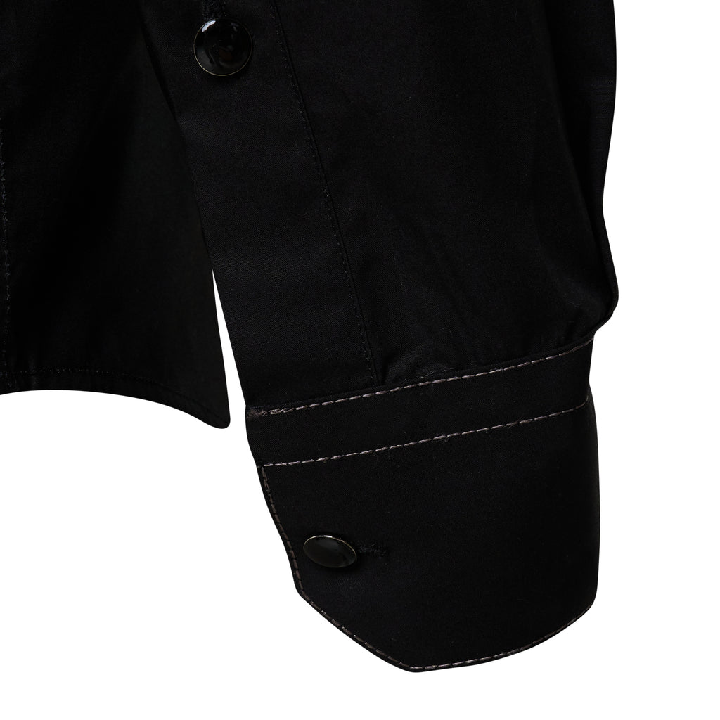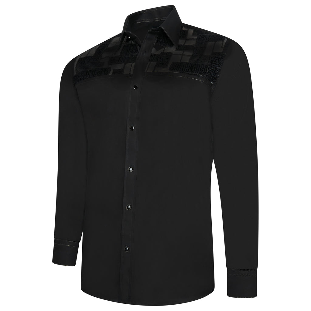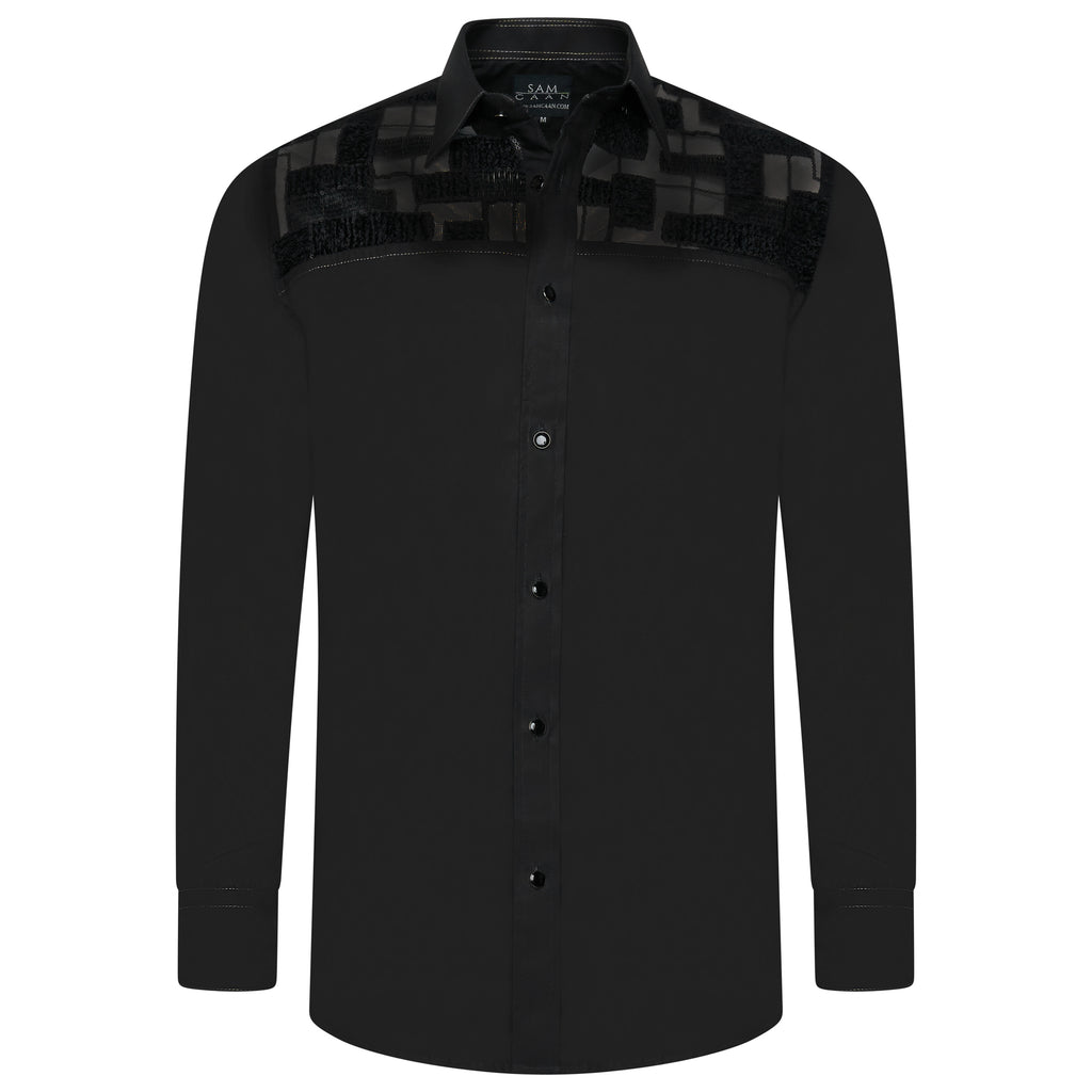 Sam Caan Slim Fit Black Shirt is a perfect blend of contemporary style and modern elegance. Crafted from 80% Cotton and 20% Polyester, it ensures a comfortable and flattering fit that hugs the body just right. The standout feature is the sheer fabric panel at the front top, adding a bold and stylish flair to this classic design. Button-down front and smart cuffs give it a refined finish, while the minimalist look keeps it versatile for both formal and casual occasions. Ideal for evening outings, parties, or making a statement at work, this shirt is a wardrobe must-have for the fashion-conscious man.