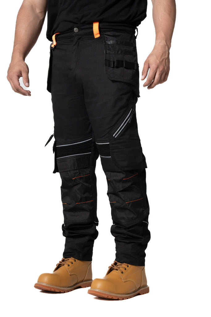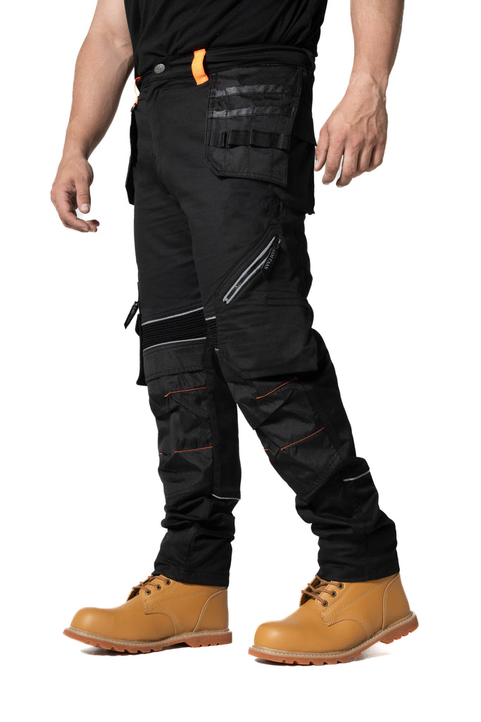 Featuring Cordura knee pad pockets, multifunctional holster pockets, reflective piping, and triple-stitched seams for durability. Ideal for builders, mechanics, and outdoor jobs.