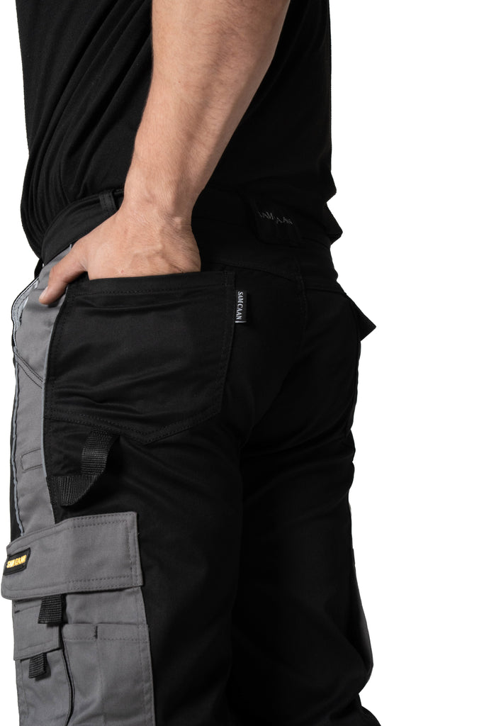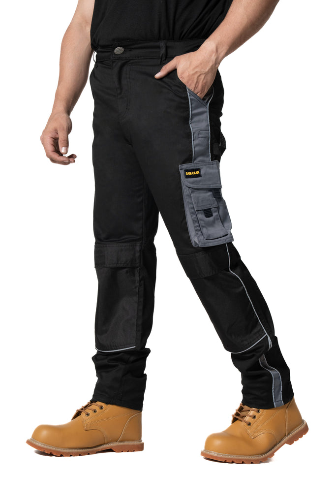 Shop and Experience Sam Caan Men’s Heavy Duty Work Trousers. Made from durable A-Grade Pro Stretch fabric 65% Polyester, 33% Cotton, 2% Elastane with triple stitching, Cordura knee pad pockets (Knee Pads are not Included), Multi Function cargo pockets and reflective piping for safety. Stylish, functional, and true to size, ideal for builders, mechanics, electricians, and outdoor use. Multiple pockets, reinforced support, and all-season comfort make them the perfect choice for reliable performance.