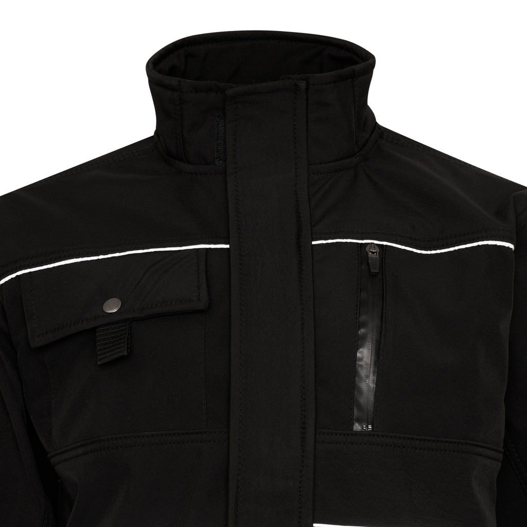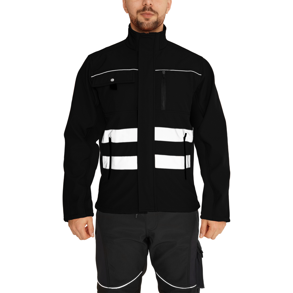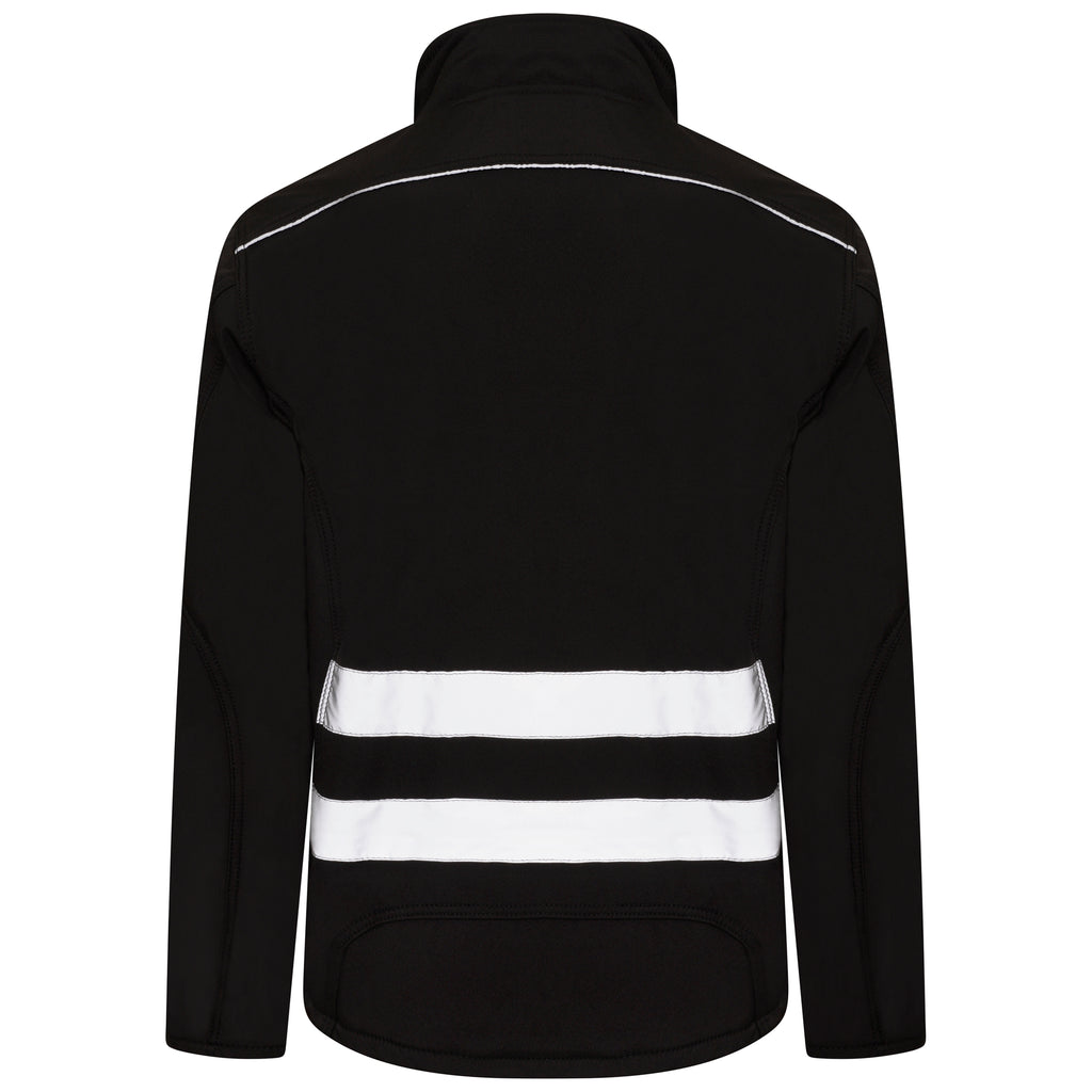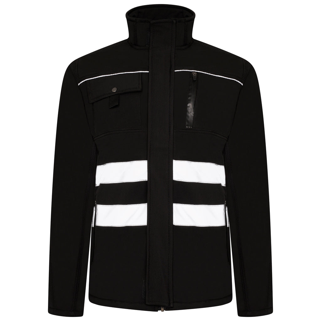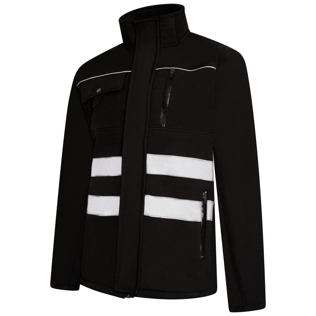 Stay visible and protected with the Sam Caan Black Hi Vis Softshell Jacket. Boasting high visibility, it features two-inch reflective tape across the waist, chest, shoulders, and back, ensuring you're easily spotted in the dark.